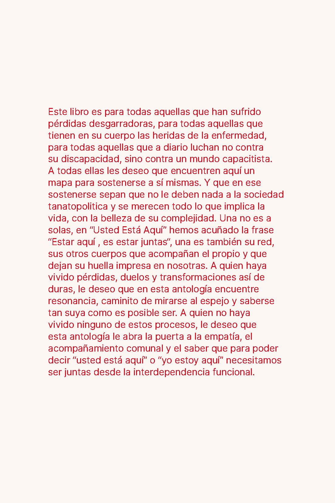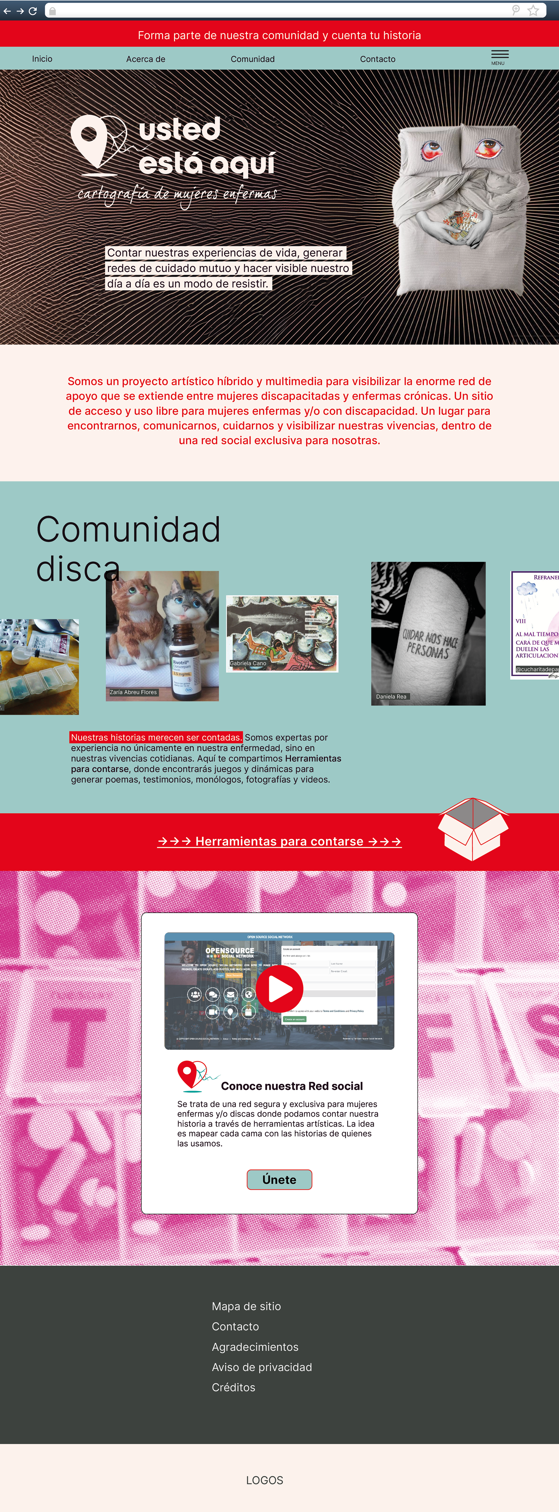 Usted Está Aquí, cartografía de mujeres enfermas es una red social en la que mujeres enfermas, con discapacidades o neurodivergentes pueden encontrarse, compartir experiencias y hacer comunidad. Se propone construir una comunidad segura y exclusiva.